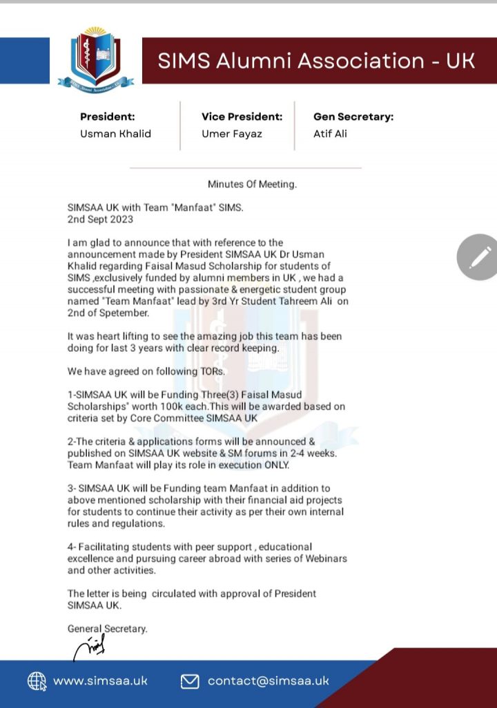 I am glad to announce that with reference to the announcement made by President SIMSAA UK Dr Usman Khalid regarding the Faisal Masud Scholarship for students of SIMS, exclusively funded by alumni members in UK, we had a successful meeting with a passionate & energetic student group named ‘Team Manfaat’ lead by 3rd Yr Student Tahreem Ali on 2nd of September.